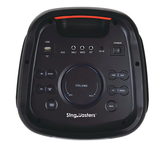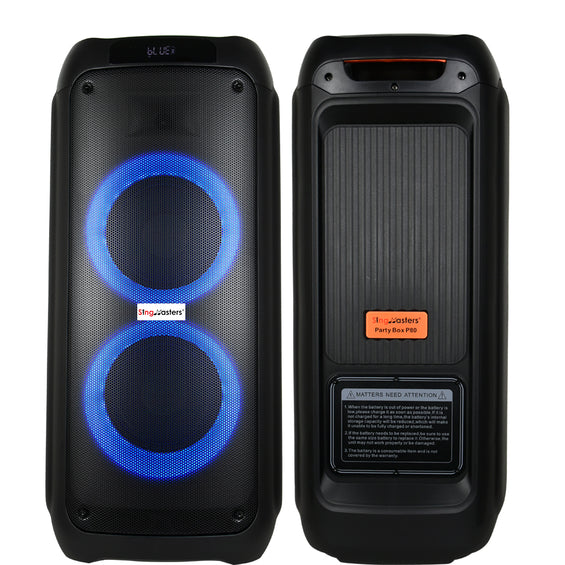 The SingMasters Party Box P80 is a powerful party karaoke speaker with excellent sound quality & LED party light effects.Thanks to its rechargeable battery and 12V DC input you can bring the party everywhere. Bluetooth,USB file playback, Aux-in, an SD card slot and FM radio support make it easy to play your music in more than one way.